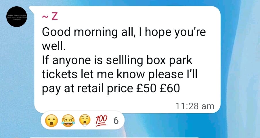 I donโt know whatโs more volatile right now, UK food prices, Bitcoin, or Boxpark player tickets. ๐ ![]() | This week alone, the group chat has seen tickets change hands through raffles, community polls, and even a fierce bidding war for the coveted Boxpark player spot. ๐ฅ ![]() ![]() |